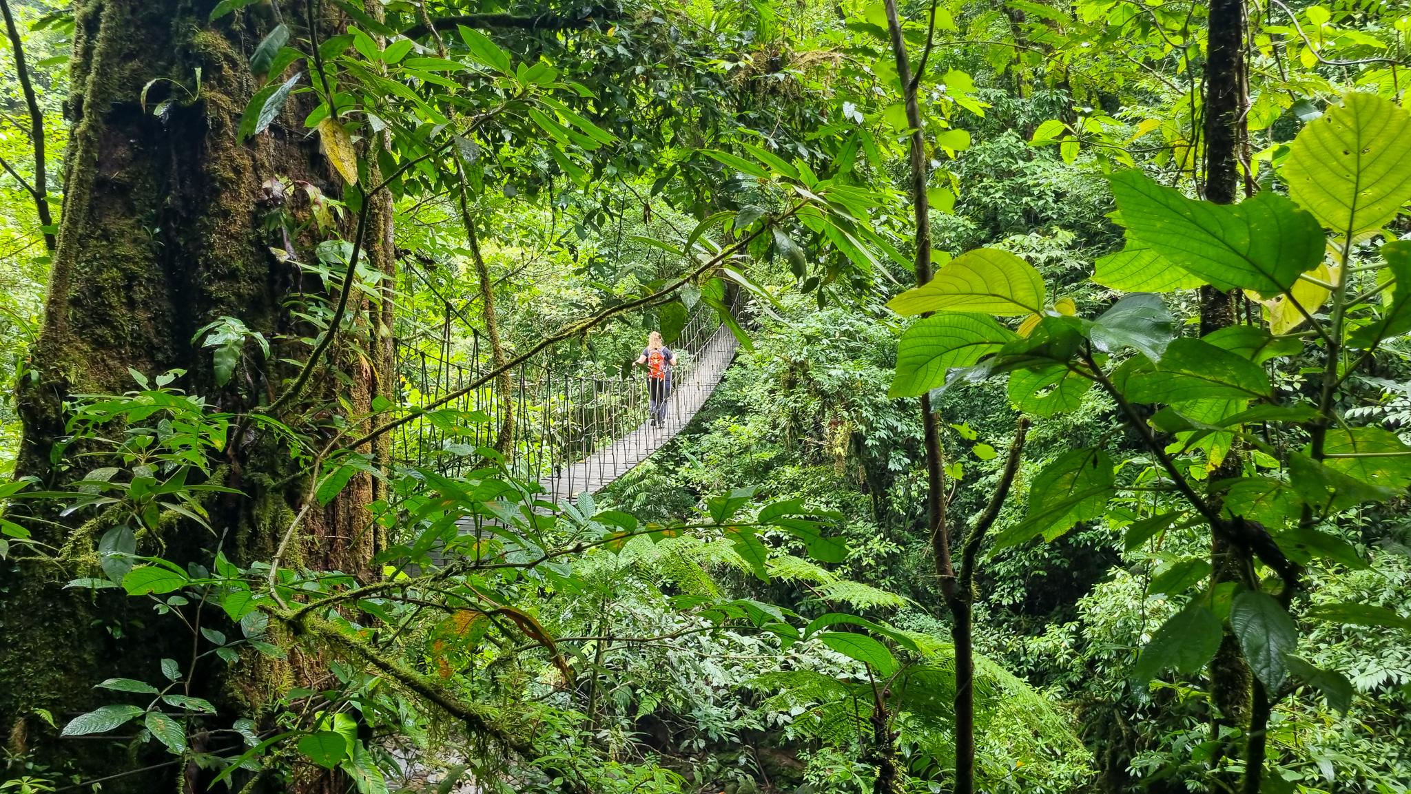 Eenmaal beneden voelt het tijdens de wandeling alsof we op een filmset zijn beland. Ik voel me als een kind in een speeltuin. We zitten echt midden in de natuur. Na de afdaling strekt het nevelwoud zich om ons heen boven ons uit. De houten bruggen die wiebelen als we er overheen lopen geven een extra avontuurlijk karakter aan het geheel. Hier geen betonnen aangelegde paden, maar we gaan over bospaadjes verder. Er is zelfs een klein beekje die we over moeten steken.