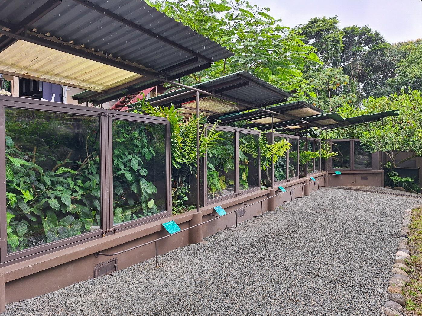 Het grote bord langs de weg geeft aan dat je er bent, de parkeerplaats is eenvoudig toegankelijk. Na het betalen van de entree kun je starten met de route over het terrein. Meteen zijn er terraria te zien met indrukwekkende boa’s. Via een paar buitenverblijven met reptielen kom je bij het overdekte gedeelte waar verschillend slangen, andere reptielen en gifkikkers te zien zijn. De kikkers vormen slechts een klein onderdeel van Reptilandia. Onder de slangen bevinden zich ook een aantal Eyelash Pitvipers. In het wild kun je deze onder andere in Cahuita en Rincon de la Vieja tegenkomen. Waarschijnlijk denk je dat ze groter zijn dan ze daadwerkelijk zijn, het is zeker de moeite om een glimp van deze mooie slangen op te vangen. En mocht je benieuwd zijn naar de giftige Fer-de-lance, deze kun je ook bij Reptilandia zien. Met de goede camouflage van de slangen is het soms goed zoeken waar de slang zich bevindt.