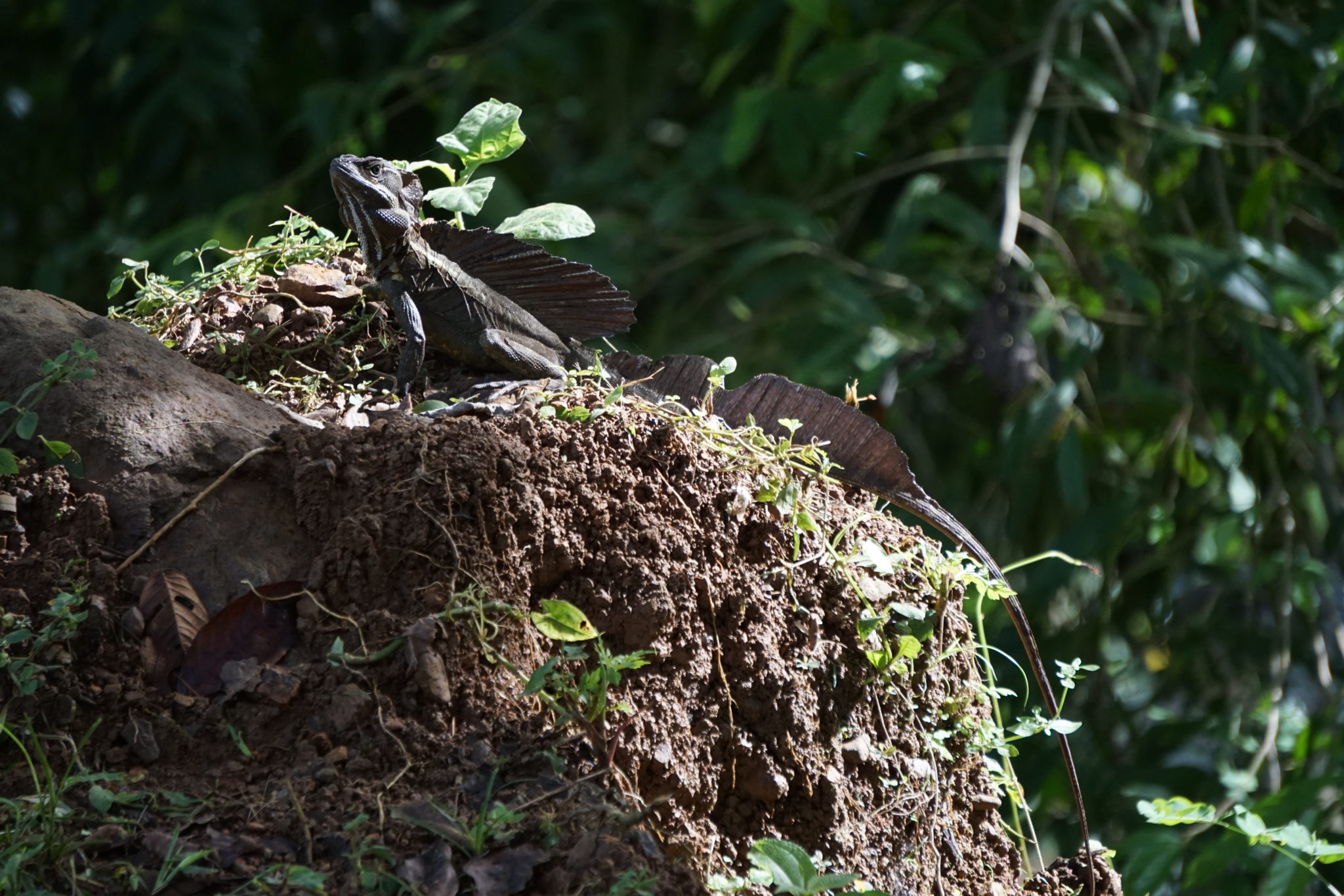 In de categorie reptielen: we altijd alert op slangen. Gelukkig zien we ze bijna niet, maar de gevaarlijke Fer-de-Lance leeft hier ook dus we zorgen er altijd voor dat we goed opletten waar we naartoe gaan als het donker is. Een keer werden we verrast door een False Coral Snake op onze badkamer. Gelukkig was Eliseo erbij en hij heeft de slang naar buiten gewerkt. Een onschuldig dier in dezelfde categorie die we wel veel zien is de basilisk. Anders is dat met de iguana’s, deze bewegen zich heel geniepig over de takken en zie je bijna niet. Ze zien jou waarschijnlijk eerder en zijn al weg voordat je het door hebt.